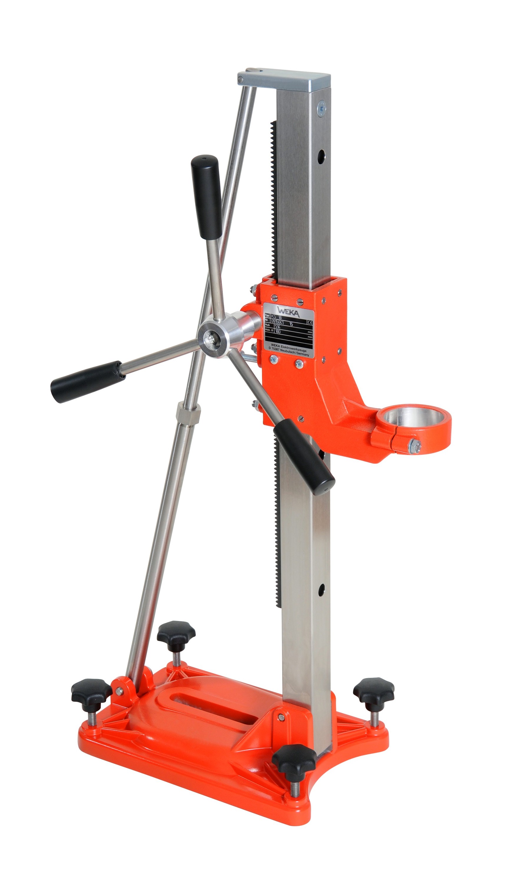 Kompakter Diamant-Kernbohrständer, hohe Stabilität, geringes Gewicht, verschleißfeste Bauteile, Schrägverstellung bis 80°.